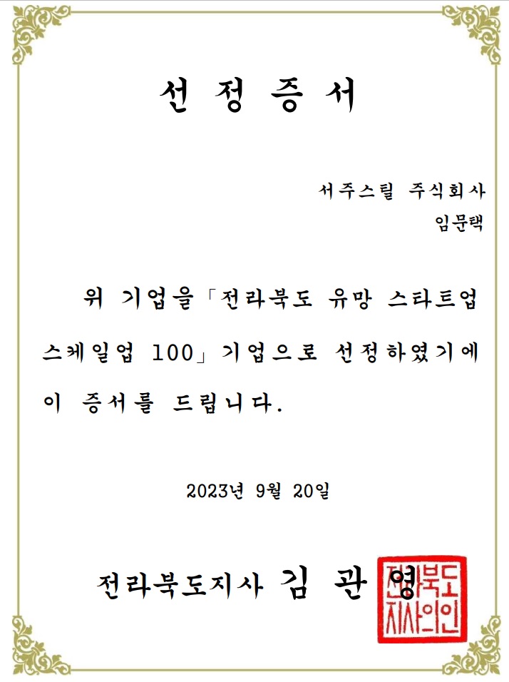 복공판 전문 기술을 가진 서주스틸(대표이사 임문택·사진)이 전라북도 유망 스타트업 스케일업 100에 선정됐다고 9월 25일 전했다.