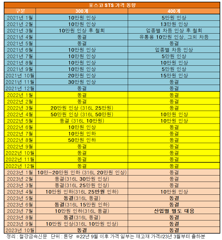포스코 스테인리스마케팅실은 10월 300계와 400계 스테인리스 출하 가격을 모두 동결한다고 시장에 통보했다. 포스코는 최근 런던금속거래소(LME) 니켈 가격이 미국 연방준비제도의 긴축 장기화 암시로 단기적인 약세 흐름을 보이고 있다고 설명했다.