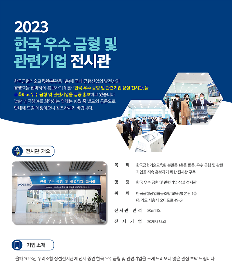 금형공업협동조합은 경기도 시흥시 한국금형공업협동조합 본관 1층에 80㎡ 규모의 기업 홍보 전시관을 운영한다고 밝혔다. ‘한국 우수 금형 및 관련 기업 상설 전시관’은 우수 금형 기업의 기술력과 업체 현황을 알리는 역할을 한다.