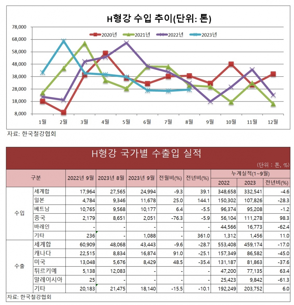 올해 1~9월 전체 H형강 수입량은 33만2,541톤으로 지난해 동기의 34만8,658톤 대비 4.6%가 감소했다. 지난해 같은 기간 톤당 850.6달러를 기록했던 수입 H형강 평균 수입 금액도 올해 1~9월은 톤당 704.2달러로 크게 떨어졌다.