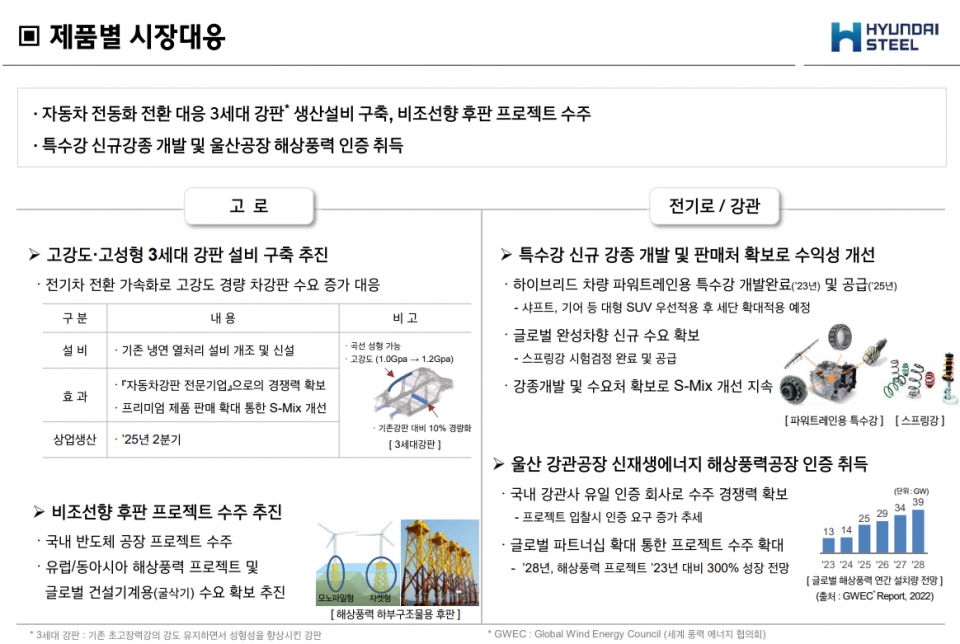 현대제철이 2520233분기 컨퍼런스콜을 개최했다. 현대제철은 제품별 시장 대응에 대해 자동차 전동화 대응을 위한 3세대 강판과 비조선향 후판 프로젝트 수주, 특수강 신규 강종 개발 등을 계획하고 있다고 밝혔다.