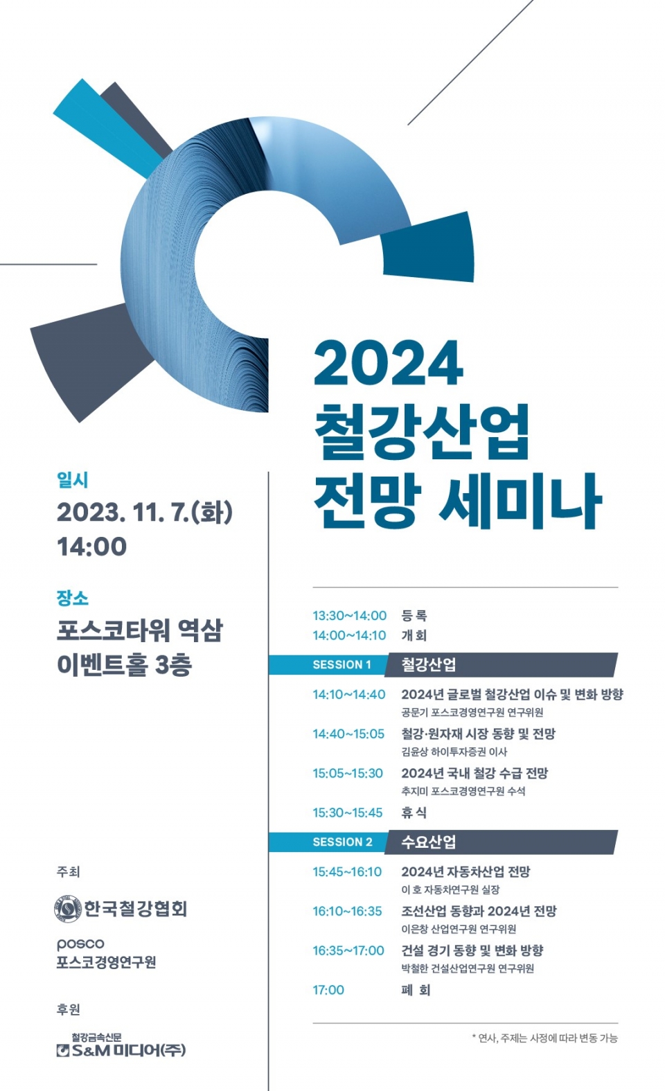 세미나는 한국철강협회와 포스코경영연구원이 공동으로 주최하며, 에스앤엠미디어(철강금속신문)가 후원을 맡았다. 참석 대상은 한국철강협회 회원사, 철강업체, 수요업체 관계자 등이며, 150여 명을 선착순으로 접수한다. 참가비는 무료다.