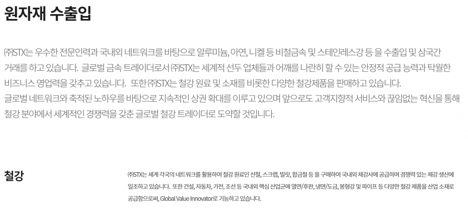게다가 STX는 니켈브리켓, 스테인리스 제품 등을 취급하며 전문인력과 국내외 네트워크를 바탕으로 니켈, 스테인리스강, 비철금속 등을 수출입 및 삼국간거래 등을 영위하고 있는 능력도 갖추고 있다. 이에 현지 수요처 외의 활용 가능성도 열려있다.