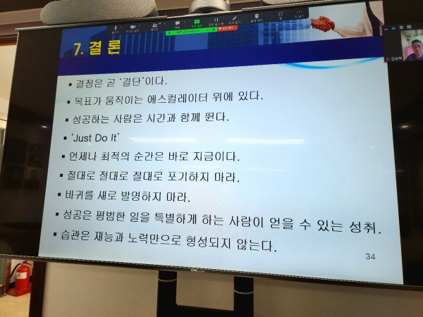 “기업가들은 살아남기 위해 발버둥치고 있다”며 직업(職業)과 직장(職場)을 찾는 젊은이들에게는 과연 혁신능력을 갖추고 문제해결 능력을 갖추고 있는가? 나는 진짜 나를 알고 있는가? 현장에서 뭘 기여하고 성과를 내고 인정받을 것인가? 내가 기업이 원하는 것을 갖추고 있는가를 생각해 봐야 한다고 주문했다.
