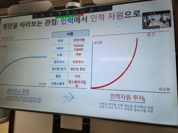토론에 나선 중소벤처연구원 오동윤 원장은 “청년을 바라보는 관점을 ‘생산요소 투입에서 인적자원 투자’로 바라봐야 한다고 말했다.” 인력→인적자원, Labor→Human Capital, 노동→자본, 생산요소→성장요소, 생산량증가→생산성 향상, 월급→가치, 고용노동부→중소벤처기업부 관리 등으로 간추렸다.