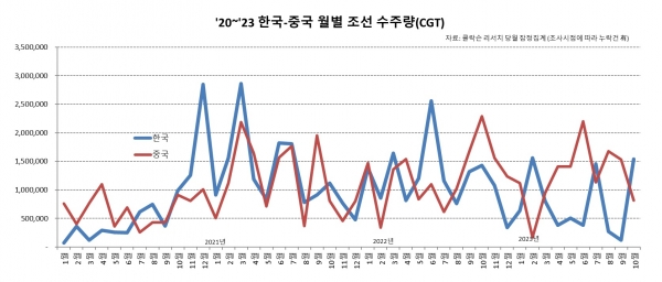 국내 조선업계가 10월 수주량 1위에 올랐으나 누계 수주량은 중국 조선업계에 이어 2위를 기록 중이다. 10월 누계 국내 조선사들의 수주량은 893만CGT(184척)를 기록 중이다. 중국의 누계 수주량은 1,933만CGT(832척)로 집계됐다.