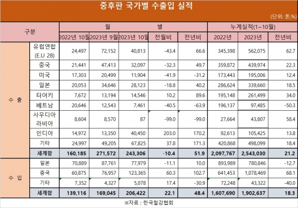 한국철강협회 통계에 따르면 올해 10월 중후판 수출은 24만3,306톤으로 전월 대비 10.4% 줄었다. 유럽연합으로 향하는 제품 수출이 4만813톤으로 전월 대비 43.4% 줄었으며 중국향 수출도 3만2,097톤에 그치며 전월 대비 32.3% 감소한 것으로 집계됐다. 10월 수출은 전년 대비 51.9% 늘었지만, 이는 지난해 태풍으로 인한 피해의 기저효과로 풀이된다.