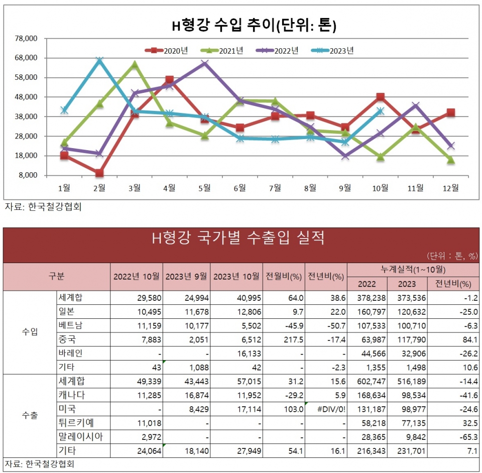 다만, 수입 물량은 84.1%가 늘어난 중국을 제외하고 일본, 베트남, 바레인에서 모두 감소를 나타냈다. 일본산 H형강은 25.0%가 줄었고, 베트남은 6.3%, 바레인은 26.2% 감소를 나타냈다. 이로써 1~10월 전체 H형강 수입량은 37만3,536톤으로 지난해 동기 대비 1.2%가 줄었다. 1~9월 수입량 감소 폭이었던 4.6% 대비 감소 폭은 줄었다.