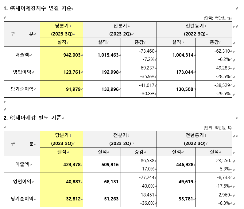 세아제강의 3분기 별도 기준 실적은 매출 4234억원, 영업이익 409억원으로 집계됐다. 3분기 매출과 영업이익은 전년 동기보다 각각 5.3%, 17.6% 감소한 수치다.