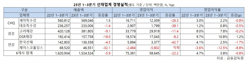 특히 이 기간 영업이익은 지난해 754억원에서 올해 586억원으로 22.2% 급감했다. 이에 따라 6개사의 영업이익률도 전년 동기(4.7%) 대비 0.8% 포인트(p) 하락한 3.8%를 기록했다.