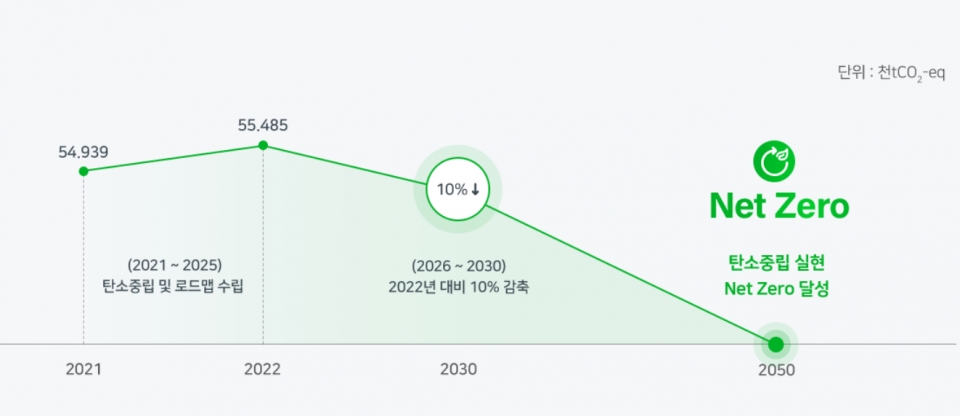 회사는 탄소배출 감축을 위해 고효율 설비 적용 및 모니터링 시스템을 통한 체계적인 관리를 추진하고 있으며, 중장기 로드맵을 설정해 오는 2050년까지 탄소중립 실현인 '넷제로(Net Zero)' 달성을 목표로 하고 있다.