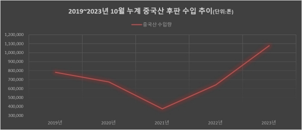 일본산 후판 수입이 줄어든 가운데 저가 중국산 유입이 대폭 증가한 것이다. 더욱이 올해 후판 수입량은 지난 2016년 이후 7년 만에 가장 많은 수준으로 나타났다. 지난 2016년 기준 후판 수입량은 223만톤을 기록했으며 당시 중국산 수입량은 155만톤 안팎으로 집계됐다.