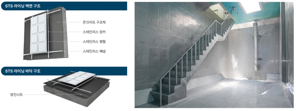라이닝은 콘크리트 벽체에 판을 용접하여 별도 방수처리가 필요 없는 벽체를 만드는 공법을 뜻하는 것으로, STS 라이닝은 내식성과 내구성, 내열성 등이 우수하고 깨끗하고 안전한 수질을 책임질 수 있는 스테인리스를 적용한다는 특징을 갖고 있다.