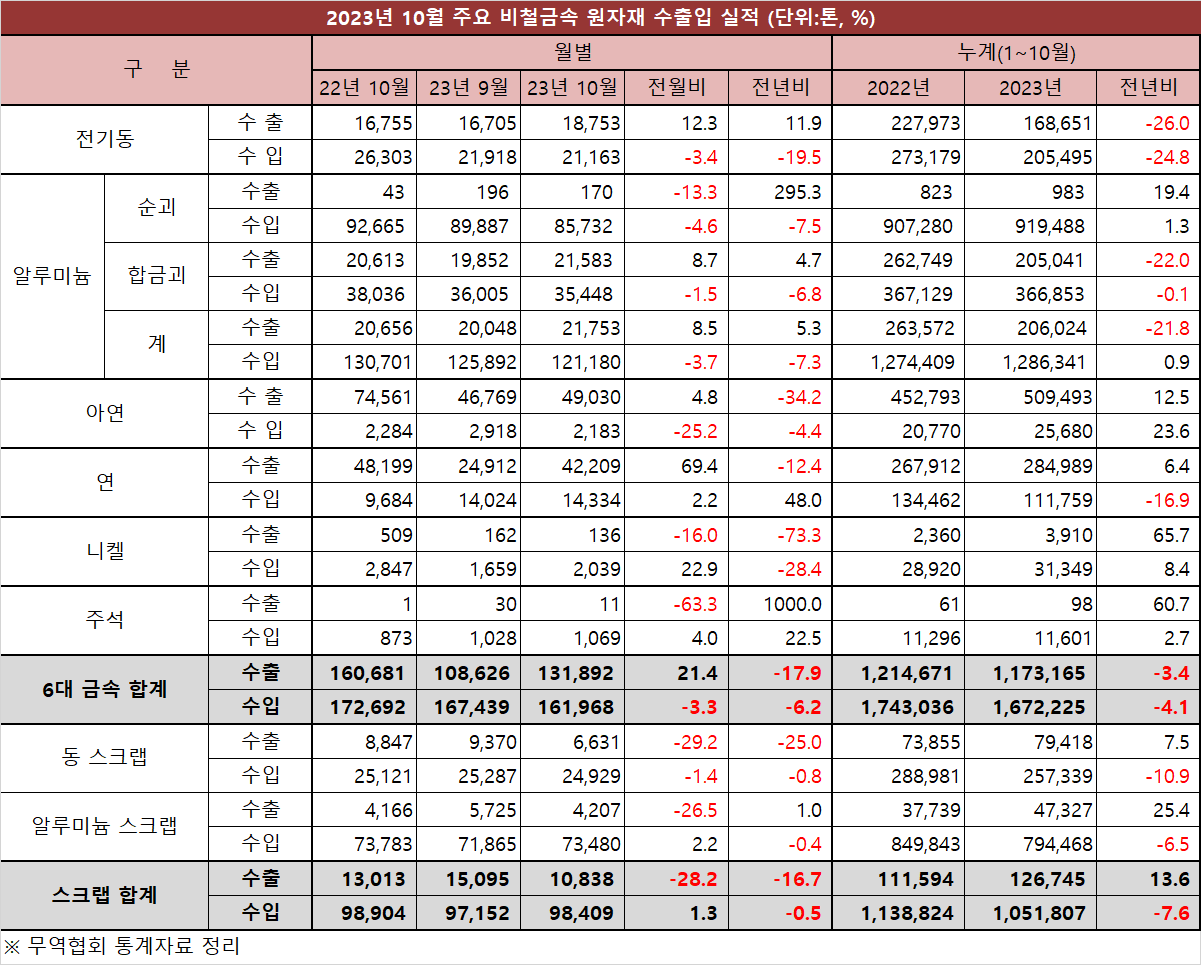 수입의 경우, 전월 대비 3.3%, 전년 동월 대비 6.2% 감소했다. 재활용 원자재인 스크랩은 10월 수입이 전년 및 전월과 유사한 수준을 보였지만 수출은 급격히 줄어드는 모습을 보였다.