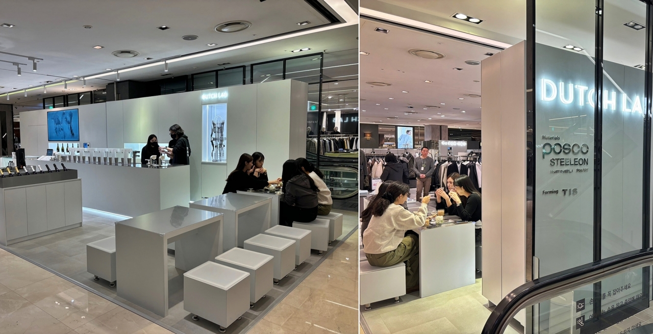 더치랩의 매장에는 포스코스틸리온의 컬러강판인 포스아트(PosART)가 적용됐다. 고해상도 잉크젯 프린트강판인 포스아트(PosART)를 매장의 모든 인테리어 내장재 및 가구로 사용한다면 폐기 시 자원 재활용이 가능하다는 점이 더치랩의 컨셉과 일치해서다. 또한 포스아트의 원소재인 포스코의 고내식 강판 ‘포스맥(PosMAC)’이 가진 내구성과 내식성 특징이 친환경적인 이점을 더해줬다는 평가다.