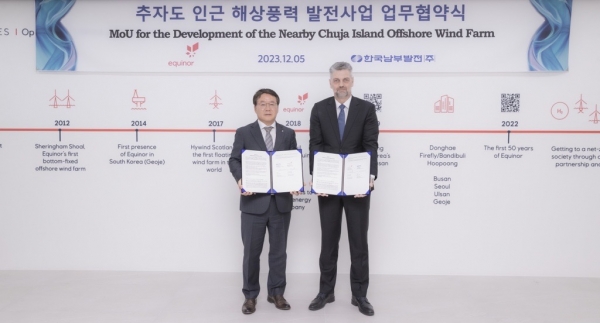 이날 협약은 양사가 추자도의 우수한 바람 자원을 기반으로 해상풍력 발전사업의 공동개발을 통한 지속가능한 미래에너지 보급을 확대해 2050 탄소중립 달성에 기여한다는 것이 골자로, 남부발전은 이를 통해 해상풍력 분야 글로벌 선두 주자인 에퀴노르와 협력해 신재생에너지 사업에 대한 개발역량을 강화할 수 있을 것으로 기대감을 드러냈다.