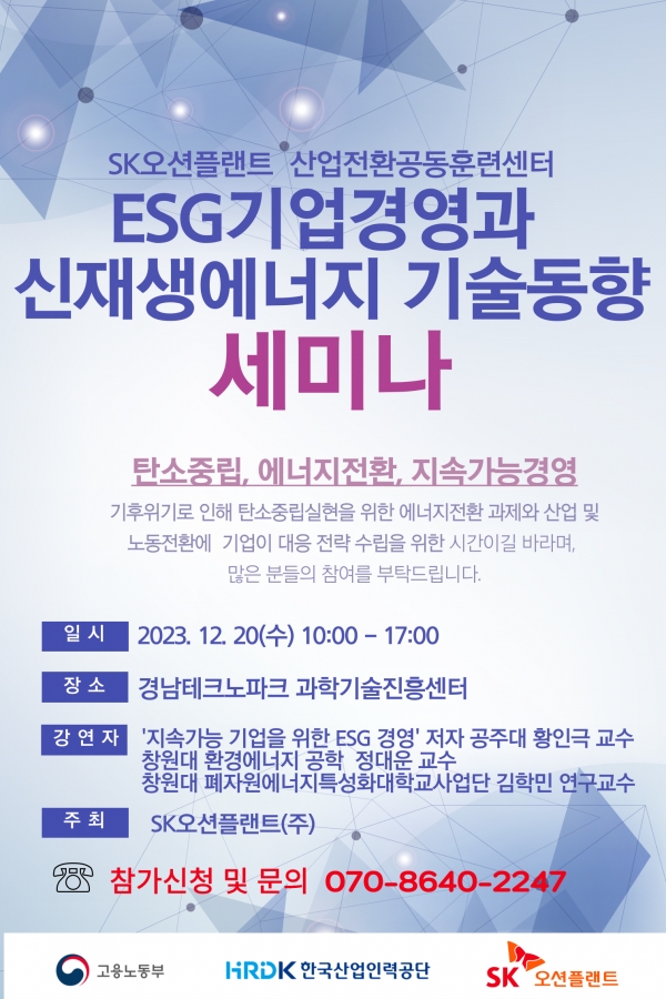SK오션플랜트 산업전환공동훈련센터는 오는 18일 창원대학교 산학협동관 국제회의장, 20일 경남테크노파크 과학기술진흥센터에서 세미나형 강연을 연다고 8일 밝혔다.