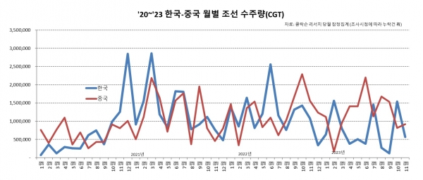 국내 조선업계는 11월 수주량 2위를 기록했으며 누계 수주량 또한 중국 조선업계에 이어 2위를 유지했다. 11월 누계 국내 조선사들의 수주량은 963만CGT(191척)를 기록 중이다. 중국의 누계 수주량은 2,209만CGT(973척)로 집계됐다.