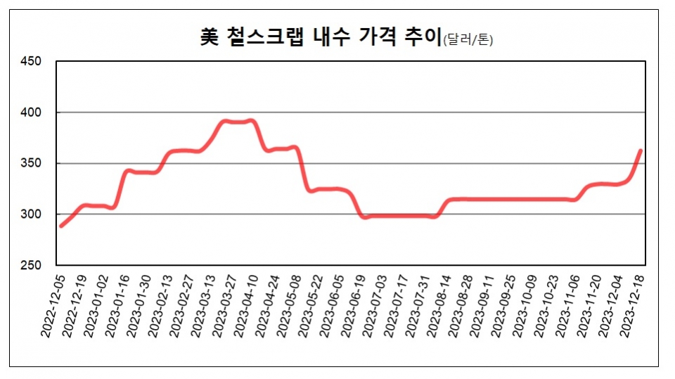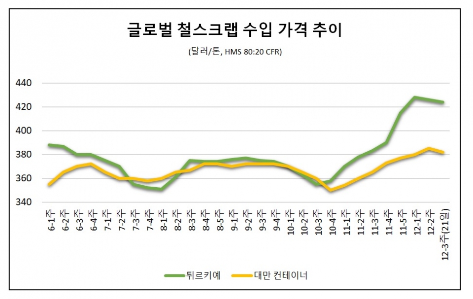 앞서 튀르키예 철스크랩 수입 가격은 지난 10월 셋째 주 저점(355달러)에서 반등 이후 7주 연속 오르면서 이달 첫째 주(428달러)까지 총 73달러 급등한 바 있다.