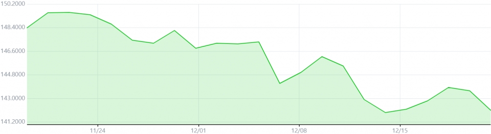 지난달 말까지 달러당 147엔을 유지하던 엔달러 환율은 12월 셋째 주 142엔까지 떨어졌다.