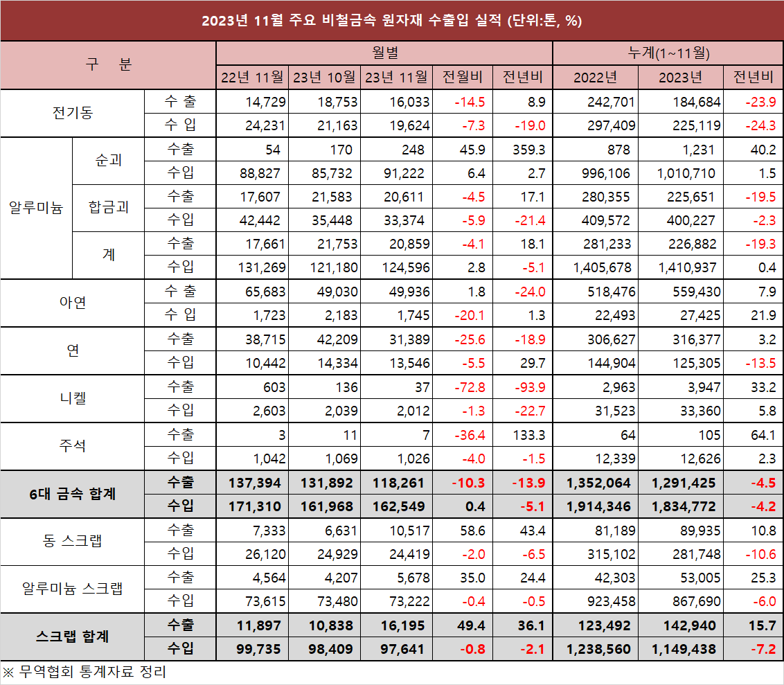 무역협회 통계에 따르면, 지난 11월 비철금속 원자재(전기동/알루미늄/아연/연/니켈/주석) 수출은 전월 대비 10.3% 감소했고 전년 동월 대비로는 13.9% 줄어든 것으로 집계됐다. 누계 기준으로는 4.5% 감소한 것으로 나타났다.