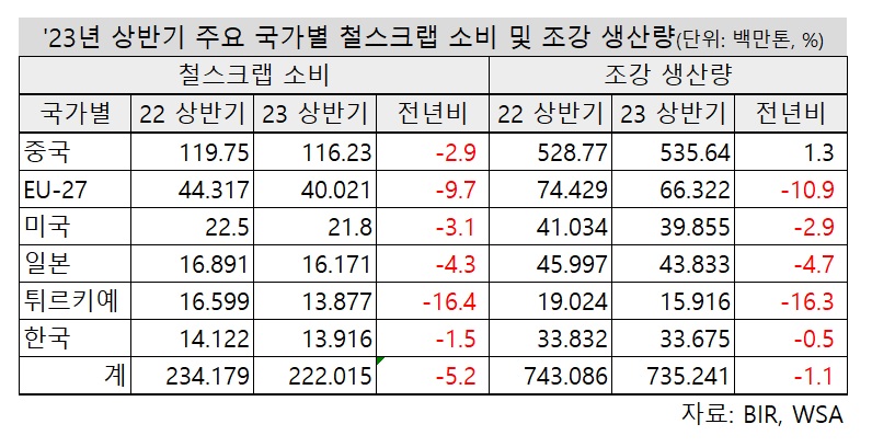 국제재활용국(BIR. Bureau of International Recycling)에 따르면 2023년 상반기 △중국 △유럽연합(EU-27) △미국 △일본 △튀르키예 △한국 등 주요 6개국에서 철스크랩 소비량은 2억2,202만톤으로 전년 동기(2억3,418만톤) 대비 5.2% 감소했다.