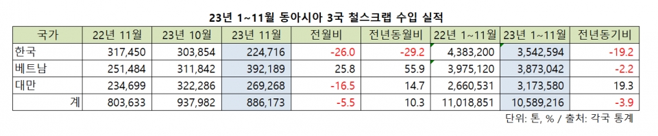 한국철강협회 등 각국 무역통계에 따르면 2023년 1~11월 한국과 베트남, 대만 철스크랩 수입은 총 1,059만톤으로 전년 동기 대비 3.9% 줄면서 감소세를 이어갔다.
