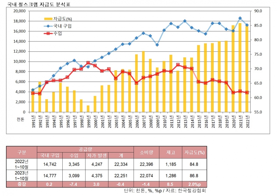2023년 1~10월 국내 철스크랩 자급률은 86.8%로 전년 동기(84.8%) 대비 2.0% 포인트(p) 상승했다.