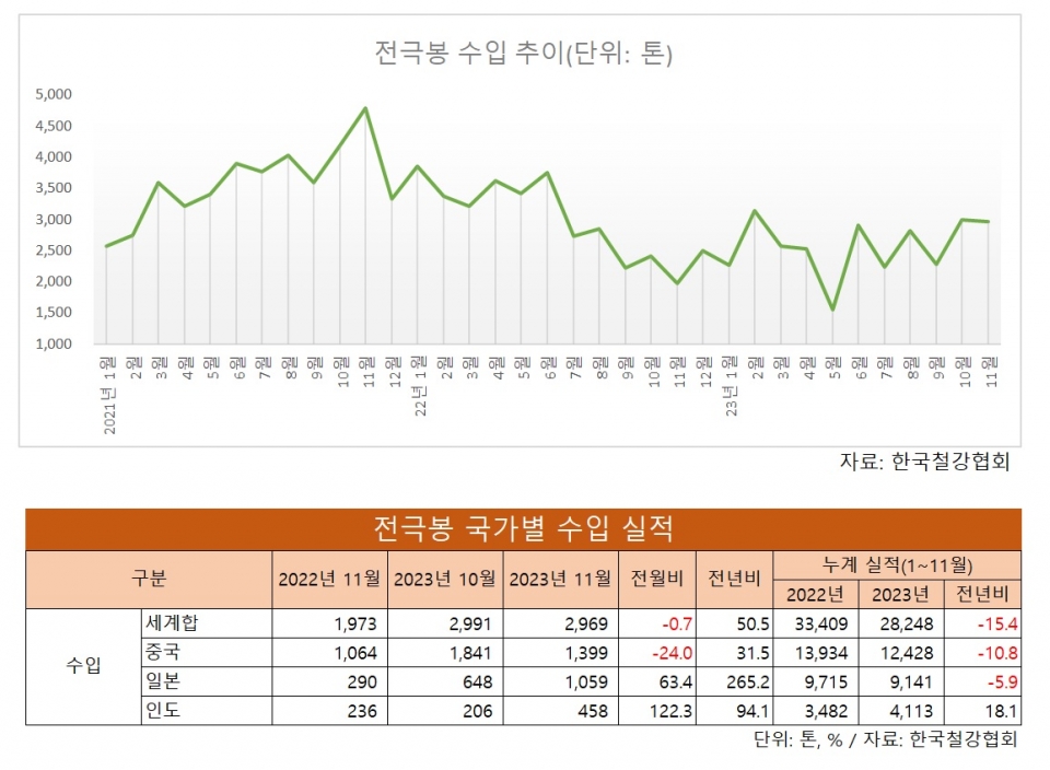 2023년 1~11월 전극봉 수입은 2만8,248톤으로 전년 동기 대비 15.4% 감소했다. 지난해 상반기(-29.5%) 대비 감소폭은 지속 줄어드는 모습이나 여전히 두 자릿수 감소세를 이어간 모습이다.
