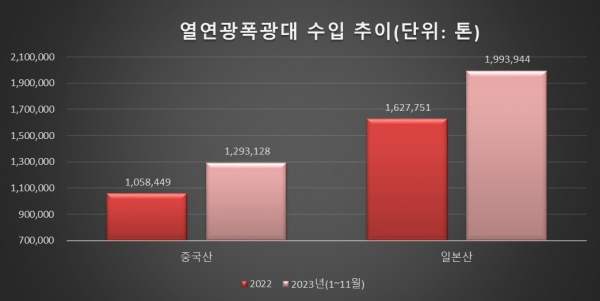 국내 철강 수요가 코로나 시기 이전 대비 완전한 회복에 성공하지 못한 가운데 수입량만 대폭 증가한 상황이다. 2023년 11월 기준 일본산 열연강판 수입량은 약 199만톤으로 2022년 연간 실적을 30만톤 이상 뛰어넘었다. 중국산 수입도 130만톤에 근접하며 전년 실적 대비 20만톤 이상 증가했다.