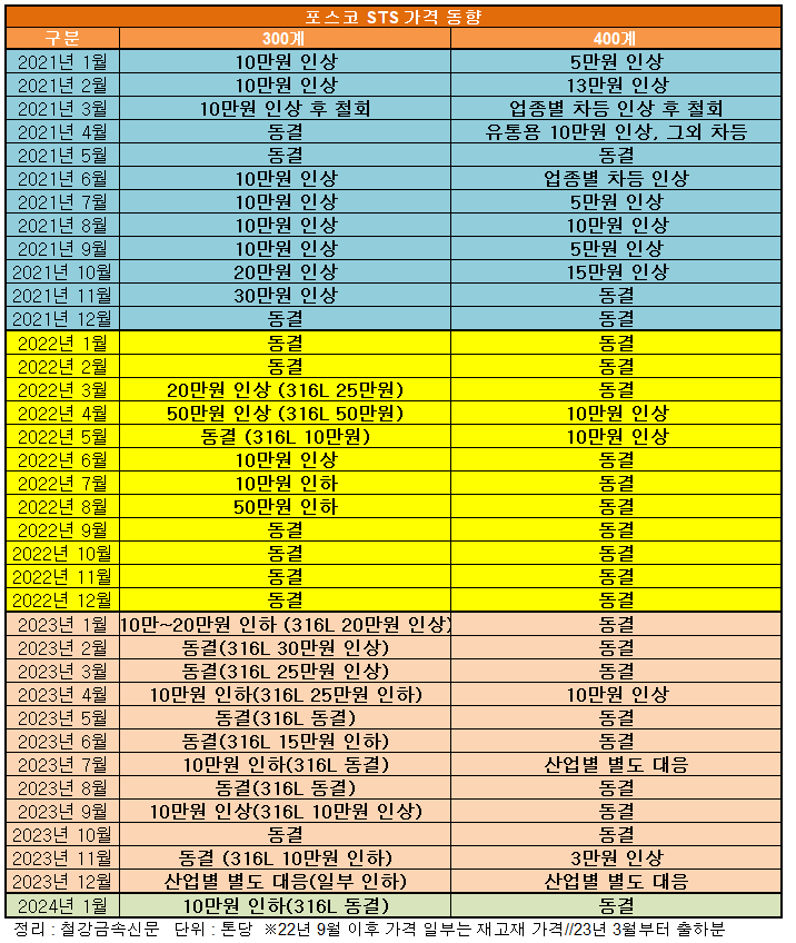포스코는 2024년 1월 300계 출하 가격을 톤당 10만원 인하하는 내용을 시장에 통보했다. STS316L 할증료와 400계 출하 가격은 동결됐다. 최근 니켈 가격을 동향을 시장 가격에 반영하면서도 조심스러운 조종 폭으로 향후 시장에 대해 관망하려는 것으로 보인다.