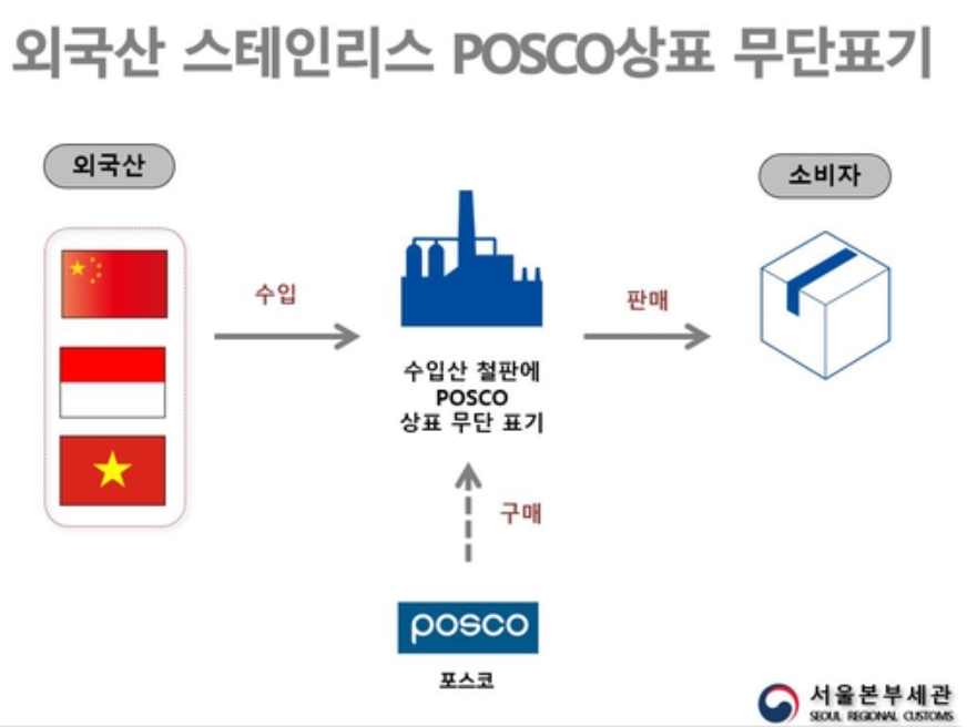 아울러 지난 11월에는 저가 수입산 STS강판에 포스코 마크를 삽입해 판매한 업체와 대표가 세관 수사로 적발 및 검찰 송치되는 사건도 발생했다. 지난해 11월 21일, 서울세관은 베트남·중국·인도네시아 등 스테인리스 저가 수출국에서 수입된 스테인리스 코일 및 강판에 수입 표시를 없애고 ‘POSCO’ 등을 (레이저)마킹하여 국산인 것처럼 속여 판매한 철강유통업체 A사를 적발했다.