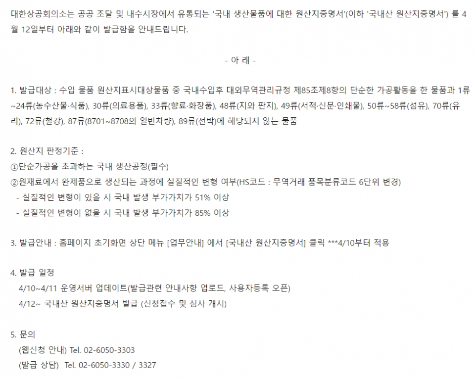국내산 원산지증명서 발급 대상은 철강 제품과 기계류, 전자·전기기기, 광학·의료기기, 플라스틱, 의류 등 광범위한 공산품이 해당(농상물과 식품 등은 제외)된다. 또한 국내에서 단순 가공이 아닌 제조공정을 거쳐야 하고 완제품을 만드는 과정에서 국내에서 발생한 부가가치가 51% 이상이어야 한다.