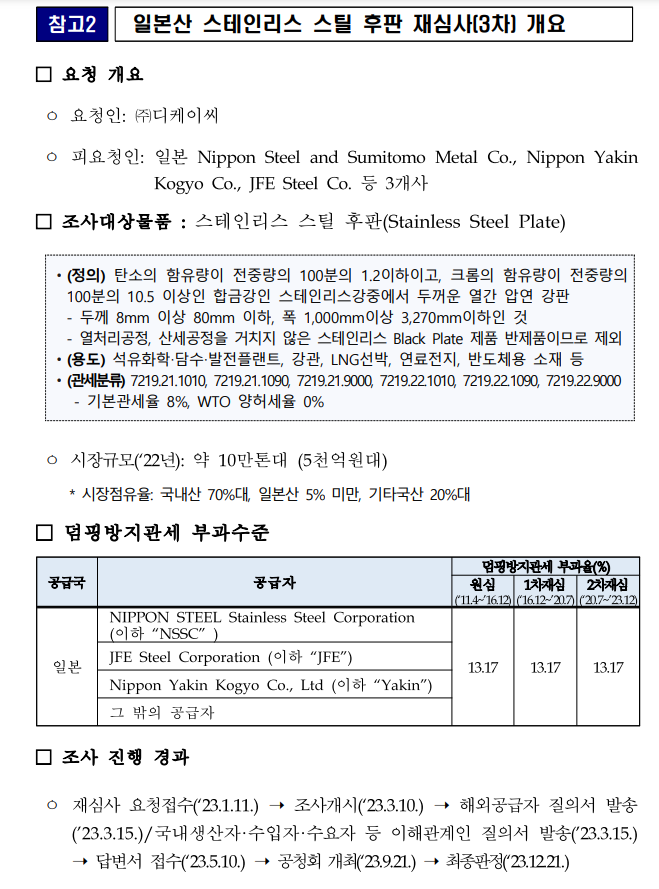 지난해 1월 국내 STS 후판 전문사 디케이씨(DKC)는 일본산 STS 후판에 대한 반덤핑 관세가 철회되면 국내 관련 산업에 덤핑 피해가 재발할 우려가 있다며 정부가 재심사를 통해 산업 피해 가능성을 확인해 달라고 요청한 바 있다.