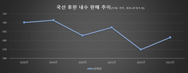 지난해 국산 후판 내수 판매가 600만 톤대에 머물며 아쉬운 성적을 거뒀다. 코로나 팬데믹 이전 국산 후판 내수 판매는 최대 수요산업인 조선업황 부진에도 700만 톤을 웃도는 실적을 나타냈으나, 최근 판매량은 수요산업 시황 개선에도 저조한 상황이다.