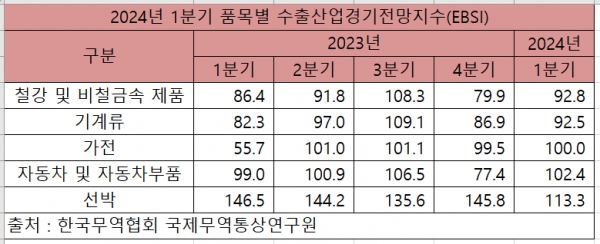 한국무역협회가 지난달 발표한 2024년 1분기 수출산업경기전망지수(EBSI)는 100을 하회하는 97.2를 기록했다. 15개 주요 품목 중 플라스틱·고무·가죽제품(122.2), 의료·정밀·광학기기(116.8), 선박(113.3), 무선통신기기·부품(110.9), 반도체(103.4), 생활용품(103.1), 자동차·자동차부품(102.4) 등 7개 품목의 수출 여건은 개선될 것으로 전망됐다.