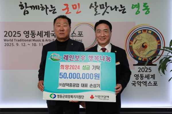경남 김해시 한림면 성덕중공업(대표 손성기)는 16일 사랑의 성금 5,000만원을 영동군에 기탁했다. 성덕중공업은 지난 2002년 창립해 경남 김해시 한림면에 위치하고 있으며 파이프 스폴과 조선, 육상, 해양 플랜트를 전문 생산하는 우수 중소기업이다.