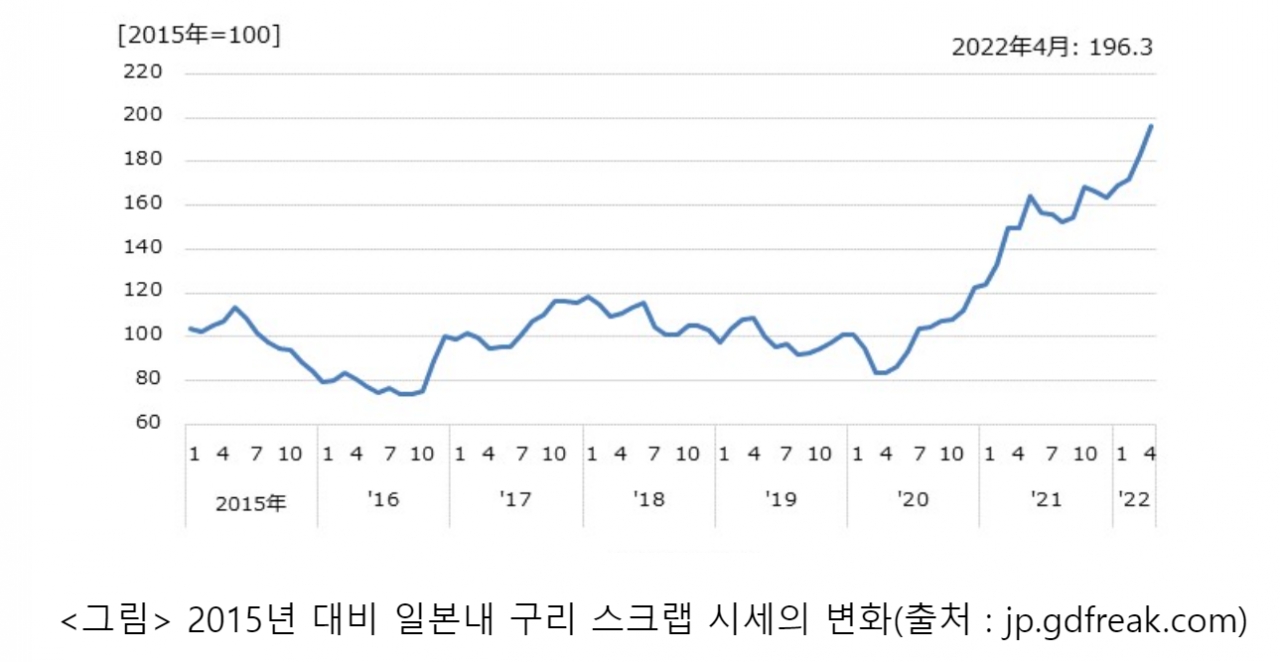 전기차 산업도 구리의 수요를 늘리고 있습니다. 배터리, 버스바, 모터 등 전기차 부품에 구리 소재가 사용되면서 내연기관차에 비해 약 4배의 구리가 필요하다고 예측됩니다. 이러한 수요의 급증에 지정학적 리스크가 더해져 22년 4월의 구리 스크랩의 가격은 2015년 대비 약 2배 상승한 가파른 상승세를 보이고 있습니다.