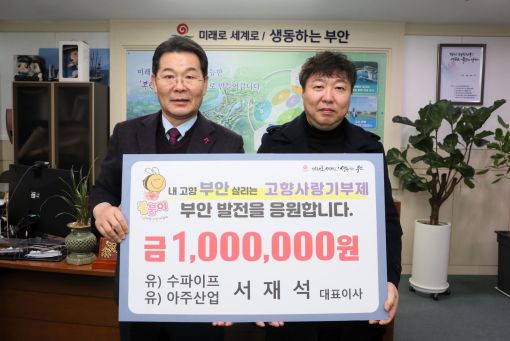 부안 제2농공단지 입주업체 수파이프, 아주산업 서재석 대표가 지난 19일 부안군에 고향사랑 기부금으로 100만원을 기탁했다.