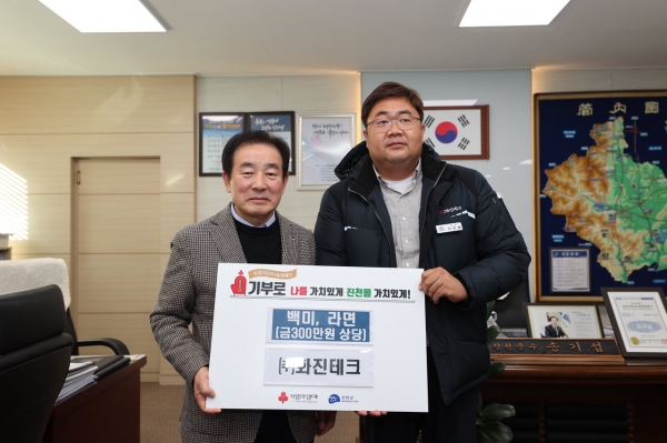 화진테크가 25일 진천군에 취약계층을 위해 300만 원 상당의 백미 360kg과 라면 84박스를 전달했다.
