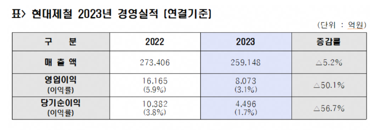 현대제철은 30일 공시를 통해 지난해 연결기준 매출액이 25조9,148억원으로 전년 대비 5.2% 감소했다고 밝혔다. 매출에 비해 수익성 지표는 모두 크게 악화됐다. 지난해 영업이익은 8,073억원으로 전년 대비 50.1% 급감했으며, 당기순이익 역시 56.7% 줄면서 4,496억원에 그쳤다.