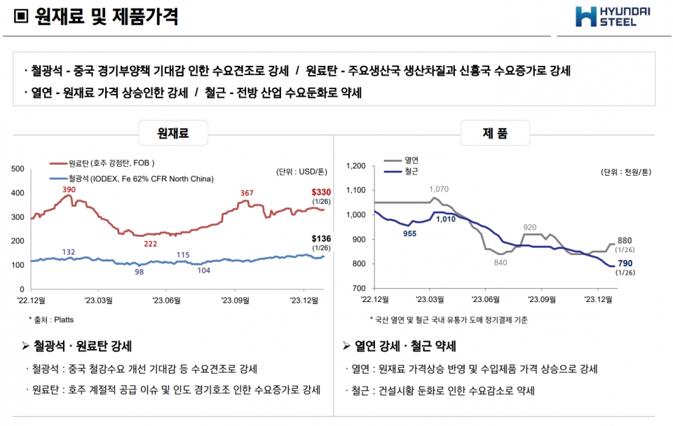 현대제철은 30일, 2023년 기업 실적 발표를 통해 원재료와 제품 가격 추이에 대해 설명했다.