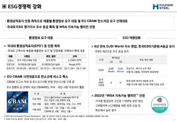 이와 함께 현대제철은 ESG 역량 강화에 나선다. 현대제철은 6년 연속 DJSI 월드 지수에 편입되고 한국ESG기준원 A등급을 유지하고 있다. 특히 현대제철은 ESG 개선으로 우수 등급을 유지하는 것으로 알려졌다, 아울러 현대제철은 2023년 WSA 지속가능 챔피언으로 선정되기도 했다.