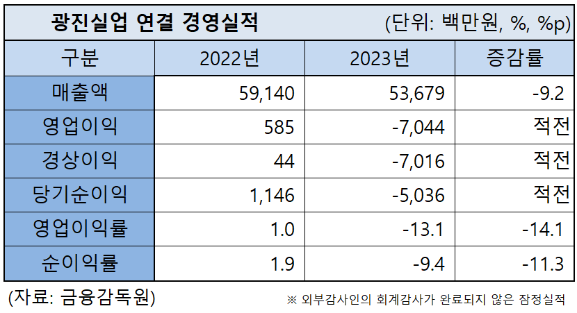 광진실업은 2023년 연결 경영실적으로 매출액 536억7,900만원(잠정 실적), 영업이익 70억4,300만원 적자를 공시했다. 매출액은 전년 대비 54억6,000만원, 9.2% 감소했고 영업이익은 전년 5억8,500만원 흑자에서 적자로 전환됐다. 이에 영업이익률은 –13.1%로 전년 대비 14.1%p 하락했다.