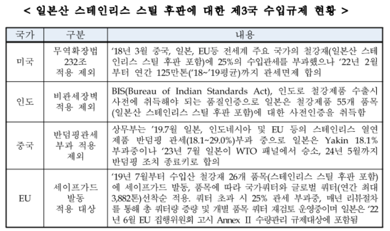 이후 지난해 12월, 무역위원회는 일본산 STS 후판에 대한 반덤핑 관세를 최종 철회한다고 밝혔다. 2월 공개한 세부 심사 보고서에 따르면 반덤핑 최초 제재와 연장된 제재 기간 일본 스테인리스 후판 업계의 생산 능력과 한국 시장 점유율이 하락한 점, 일본산 STS 후판에 대한 미국, EU, 중국의 규제 감소로 한국향 수출 비중이 적어진 점, 국내산 STS 후판이 상대적으로 가격이 높아진 점 등 관세 철회 이유로 꼽았다.