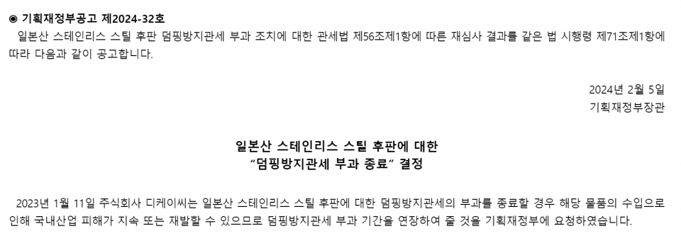 기획재정부는 ‘공고 2024-32’를 통해 일본산 STS 후판에 대한 반덤핑 방지 관세 부과를 종료할 예정이라고 밝혔다. 일본산 STS 후판은 국내 STS 후판 공급자들의 요청과 통상 당국의 판단으로 지난 2011년부터 JFE스틸, NSSC, 얀키공업 등 일본 주요 STS 제조사 후판의 10% 초반대의 반덤핑 관세를 받아왔다.