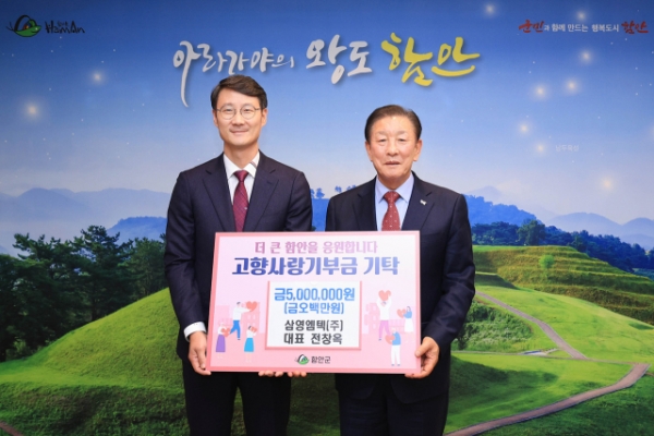 전창옥 삼영엠택 대표는 지난 14일 함안군 군청을 방문해 고향사랑기부금 개인 연간한도액인 500만원을 조근제 군수에 기탁했다.