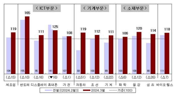 업종 유형별로는 정보통신기술(ICT) 부문에서 128을 기록, 7개월 만에 최고치를 기록했다. 기계부문(114)과 소재부문(113) 역시 5개월 만에 100 상회했다. 세부 업종별로는 철강(120), 자동차(119), 조선(112), 기계(111) 등 전통제조업들이 기준치를 상회했다.
