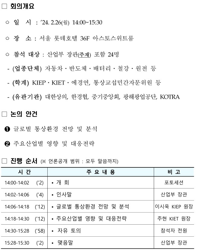 회의 참석자들은 올해 예상되는 글로벌 통상환경이 매우 엄중하다는 데 인식을 같이하고, 정부가 보다 신속하게 정보를 공유하고 선제적 대응을 해줄 것을 요청했다. 아울러, 주요국의 자국중심주의 산업정책 도입 등 당면한 현안에 대해서도 적극적인 대응을 요청하였다.