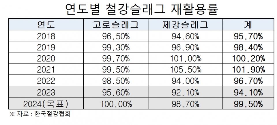 2024년 지정부산물 이용목표율은 95%로 협회와 슬래그 업계는 고로슬래그 재활용율을 100%로, 제강슬래그 재활용률을 98.7%로 높여 철강스래그의 올해 평균 재활용율을 99.5% 수준까지 끌어올릴 계획이다. 계획대로라면 2015년 고시 시행 이후 네 번째로 높은 철강 슬래그 재활용률을 기록할 전망이다.